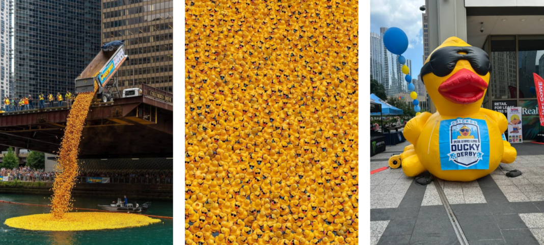 На сонячному березі річки Чикаго тисячі людей зібралися, аби побачити, як з мосту Колумбус-стріт у воду одночасно пірнуть десятки тисяч качок – усе задля підтримки спортсменів з інтелектуальними порушеннями. Участь у перегонах могла взяти кожна охоча гумова пташка, якщо її “всиновили” за $10.