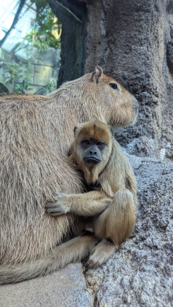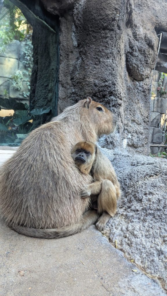 16-річна мавпа на ім’я Бая та 6-річна капібара Ребекка подружилися в експозиції Tropical Discovery. Обидві самки опинилися серед численних “хлопців” – саме це, можливо, стало поштовхом для появи особливого зв’язку.