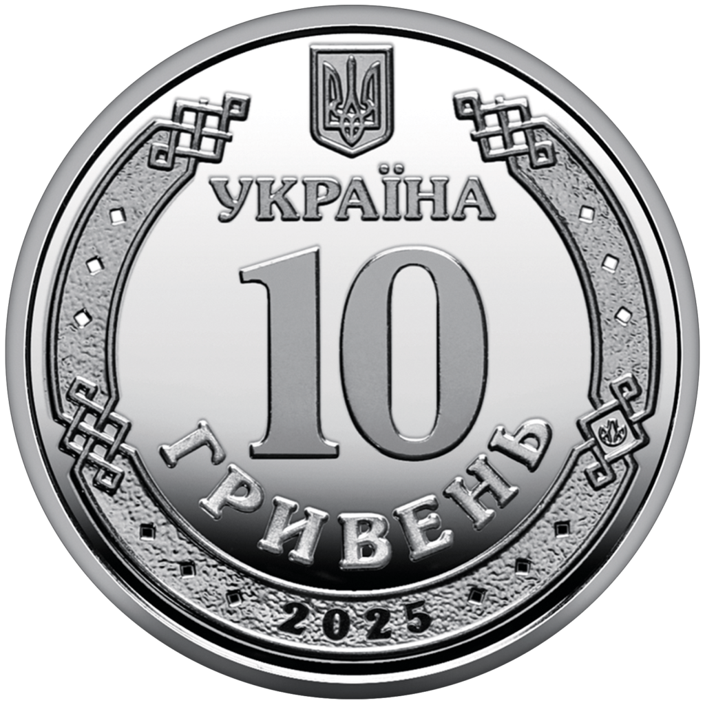 Монету номіналом 10 гривень виготовили зі сплаву на цинковій основі з нікелевим покриттям. Її аверс ідентичний звичайній обіговій монеті цього номіналу: у центрі – герб України, рік карбування та номінал у декоративному давньоруському обрамленні.