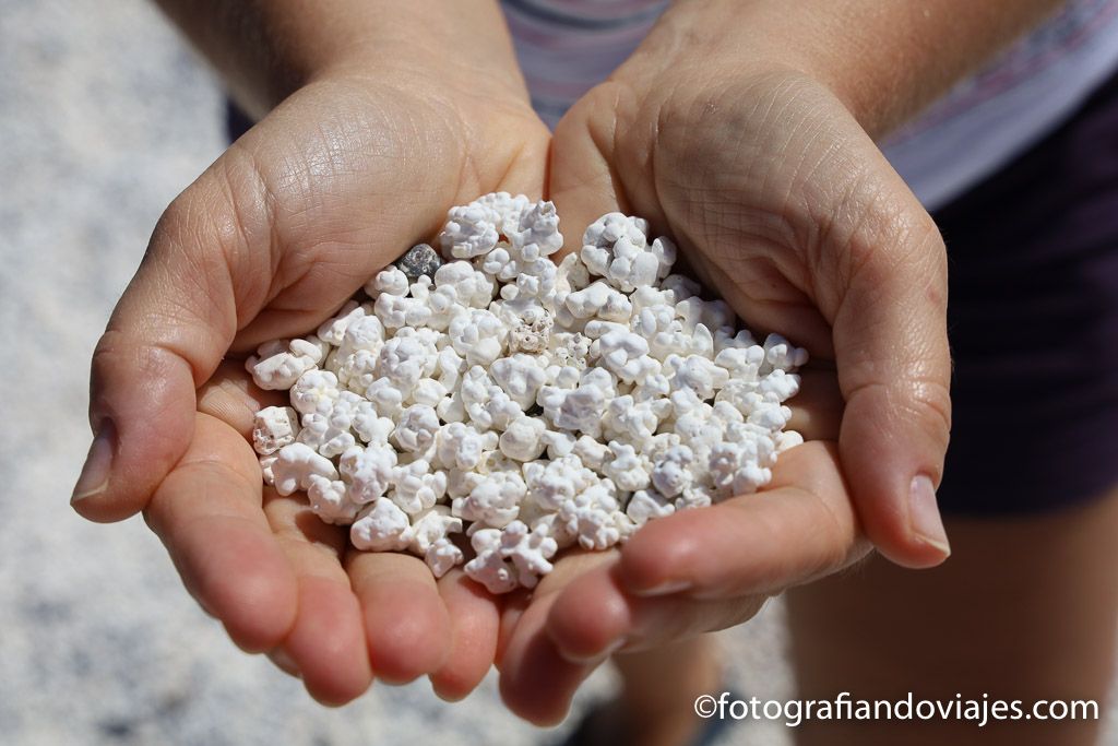 Його назва в перекладі з іспанської означає “пляж ослячого черева”, однак прославився він зовсім не завдяки легендам чи історіям, а через дивовижне природне явище. Тут під ногами відпочивальників замість звичного дрібного піску — цілі килими дрібних білих грудочок, що вражаюче нагадують зернятка попкорну.