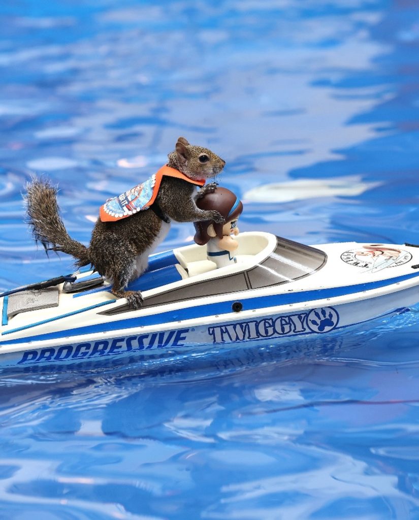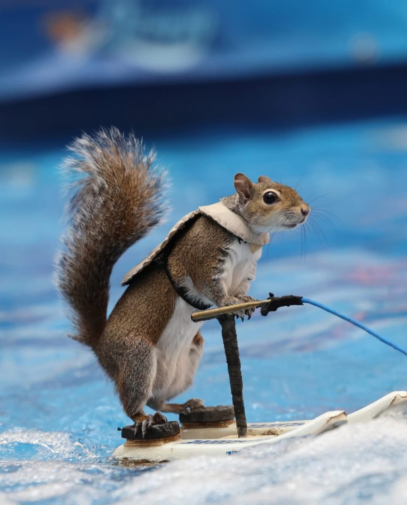 Це вже не перша Twiggy у світі воднолижного спорту. Першу білку з таким іменем усиновили Лу Енн та Чак Бест у 1979 році — після того, як ураган Девід вибив маля з гнізда у Флориді. З того випадку все й почалося: подружжя тренувало білок кататися на воді, і Twiggy стала справжньою легендою американських шоу.