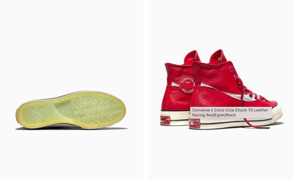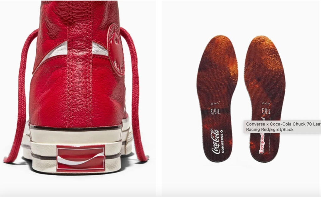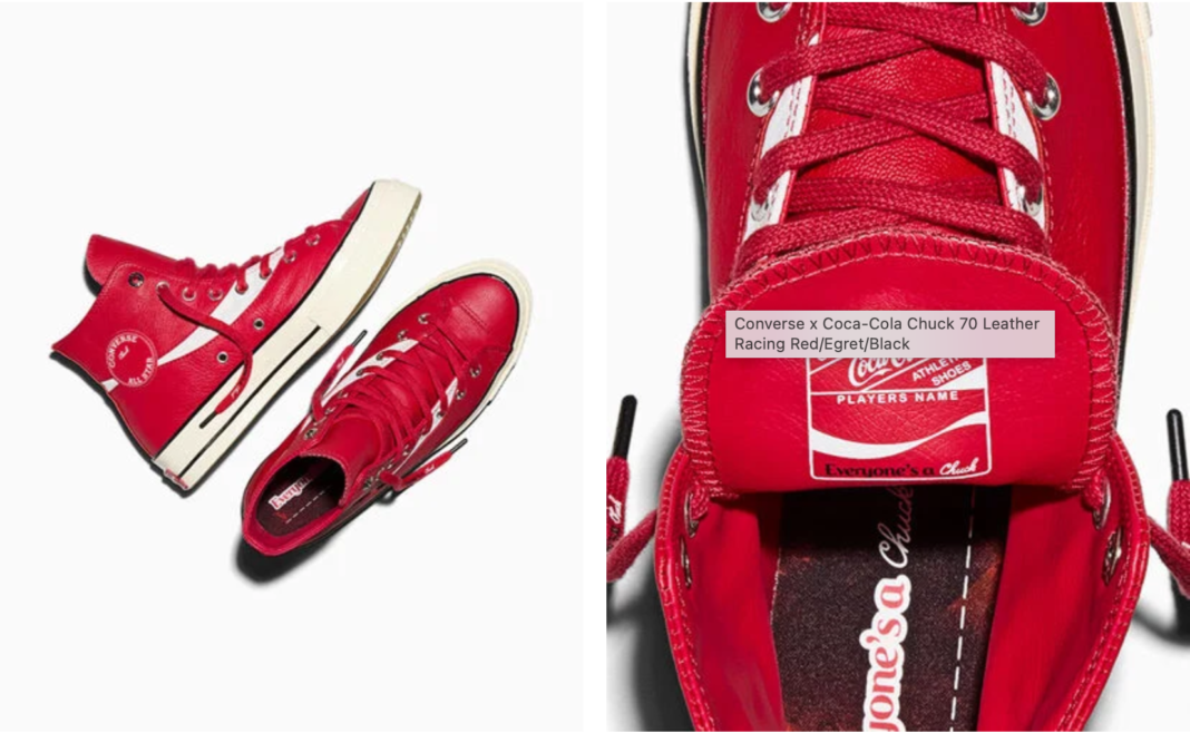 Першими на ринок вийдуть червоні кеди, натхненні знаковою айдентикою Coca-Cola. Верх виконано з гладкої червоної шкіри, яку перетинає додаткова вставка у формі фірмового напису бренду — впізнаваний логотип простягається від п’ятки до нижніх люверсів.