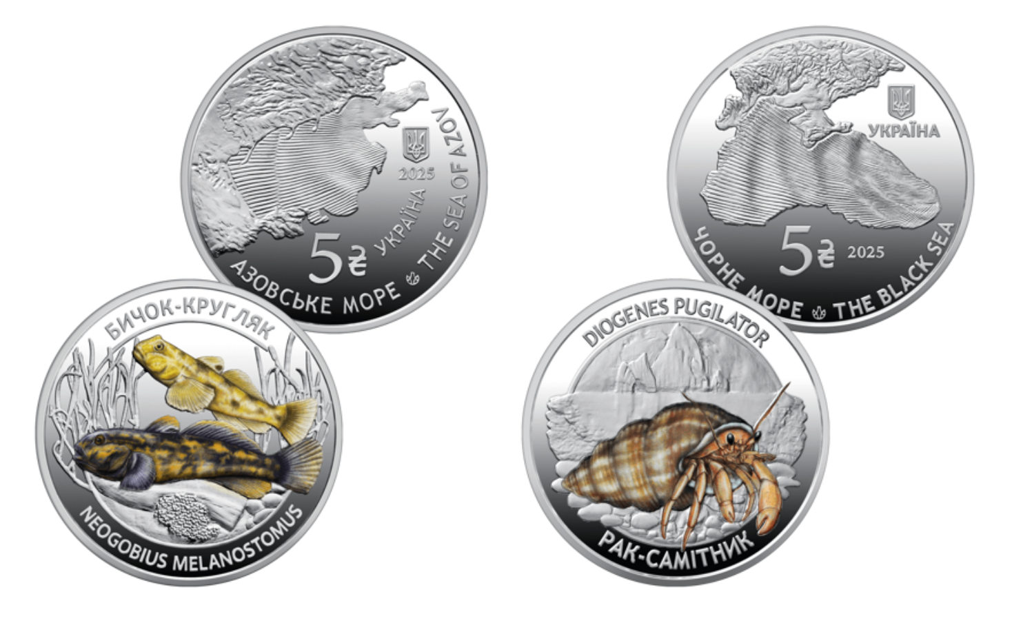 Монети номіналом 5 гривень кожна присвячені двом представникам морської фауни — раку-самітнику (мешканцю Чорного моря) та бичку-кругляку (мешканцю Азовського).