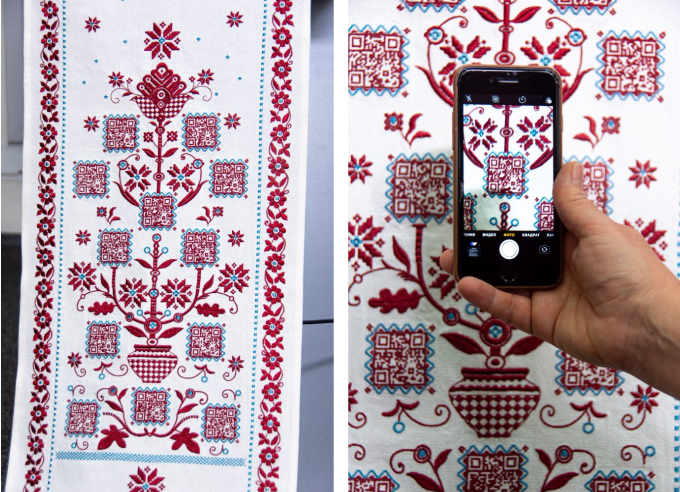 Авторка рушника, майстриня Леся Чернюк, вмонтувала у візерунки QR-коди, що ведуть до рецептів традиційних українських страв з проєкту “Старосвітська кухня України“.