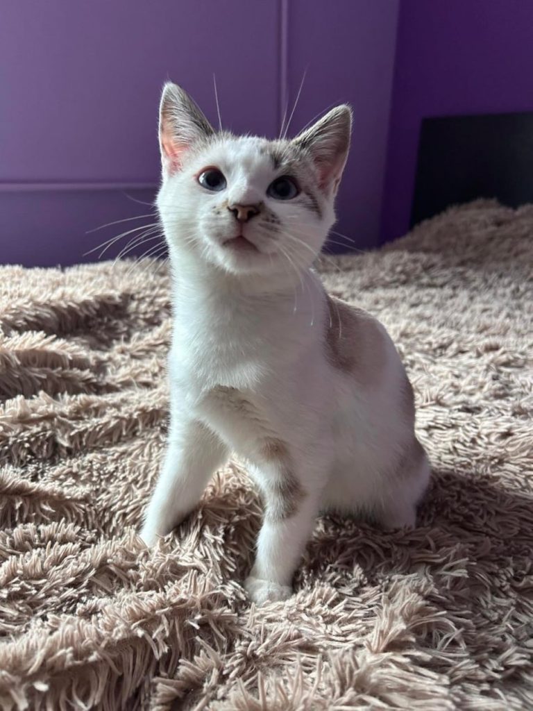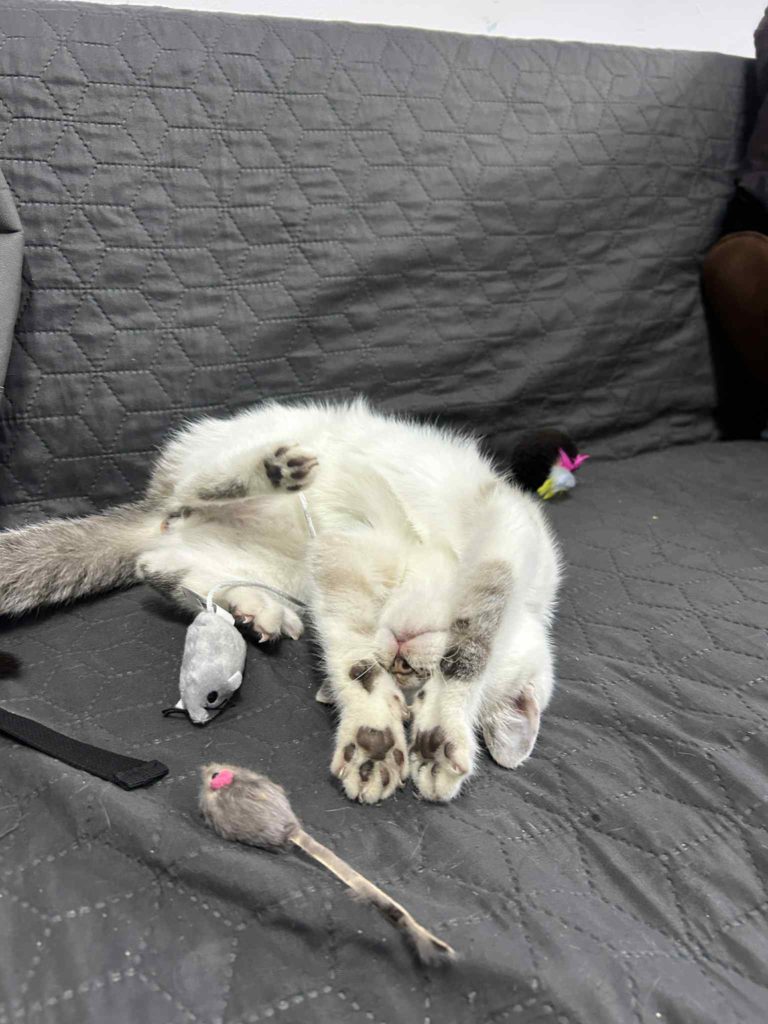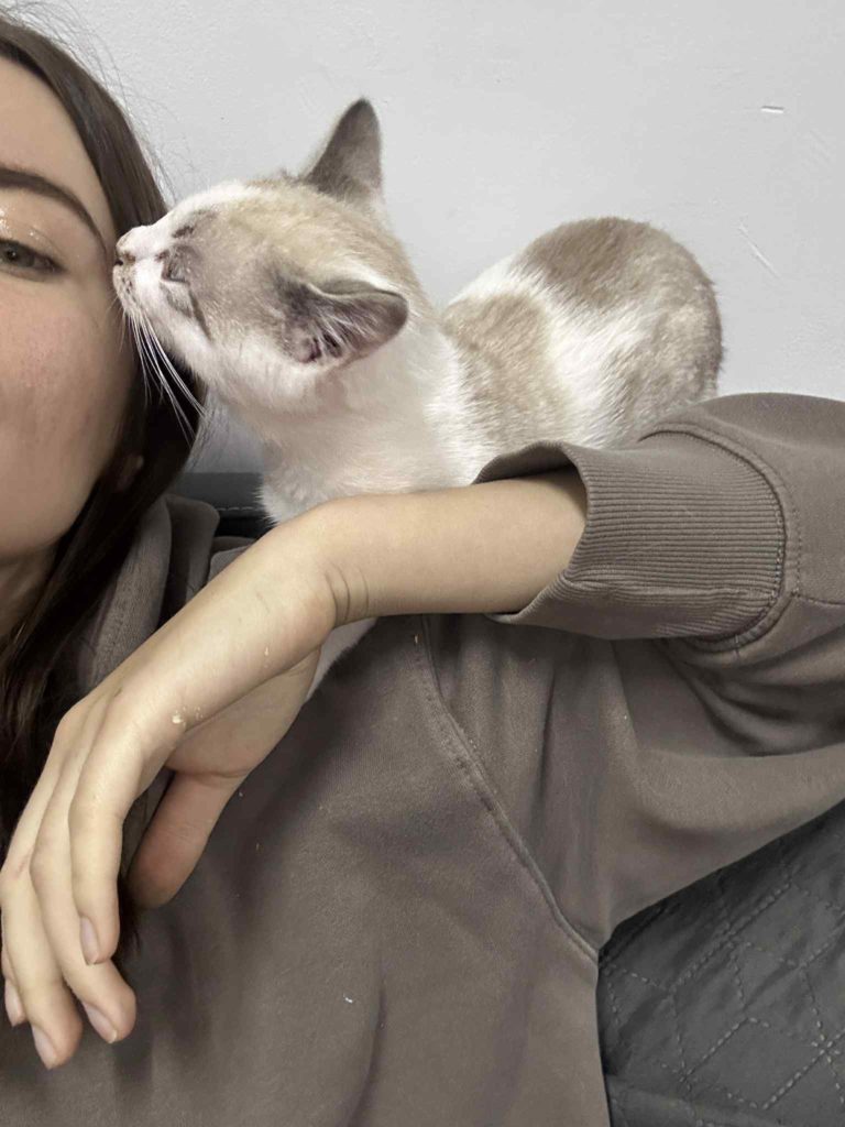 Мілана розповіла, що не одразу планувала забирати кошеня до власної оселі. Зазвичай вона тимчасово утримує врятованих тварин у клініці або своїй арт-студії. “У мене вдома два коти й собака, тому спершу тримала нового окремо. Але він дуже лагідний, весь час хоче сидіти на руках. Сам у студії сумував, тому я забрала його додому”, — каже волонтерка.
