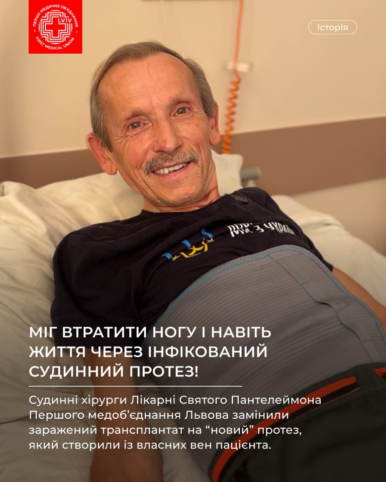 У Лікарні Святого Пантелеймона врятували ногу 67-річному львів’янину Богдану Жорняку, в якого інфікувався біфуркаційний судинний протез. Чоловік має синдром Леріша — стадію атеросклерозу, за якої звужуються черевна аорта та клубові артерії і різко погіршується кровопостачання нижніх кінцівок. Три роки тому для відновлення кровотоку йому встановили внутрішній протез.