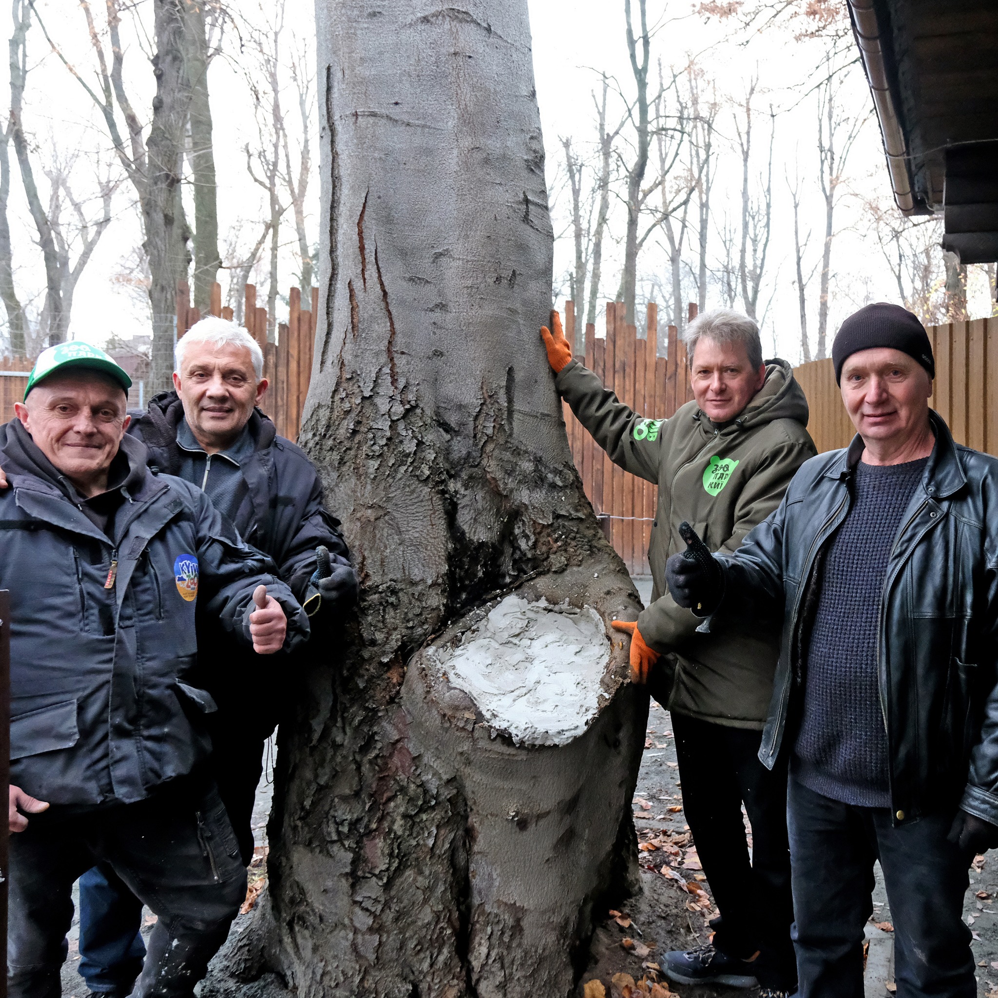 До робіт долучився і директор КЕКЦ Володимир Борейко, який надав консультації та особисто допоміг із порятунком дерева. У зоопарку зазначають, що тривалий догляд — від обрізки та підживлення до фарбування стовбурів — триває завдяки сприятливій погоді без морозів.