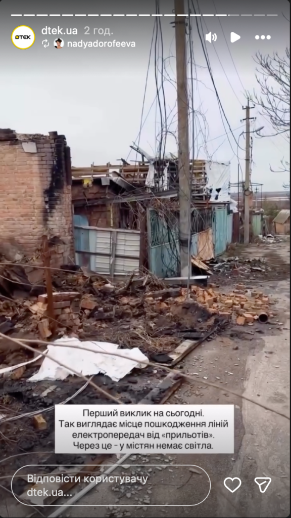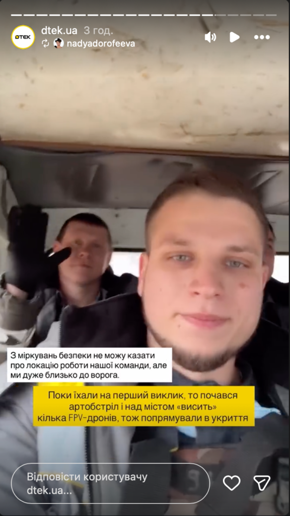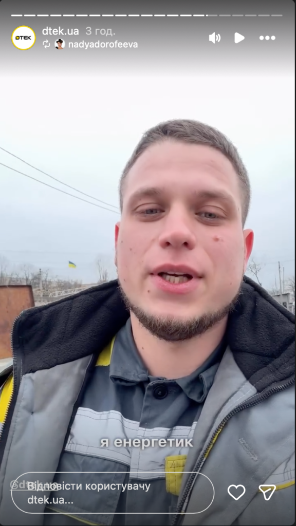 Сторіз артистки веде Максим Яценко — майстер бригади ДТЕК Дніпровських електромереж, який працює в компанії з 2018 року. Упродовж дня він демонструє робочі будні енергетиків та розповідає, як фахівці відновлюють електропостачання після ворожих ударів.