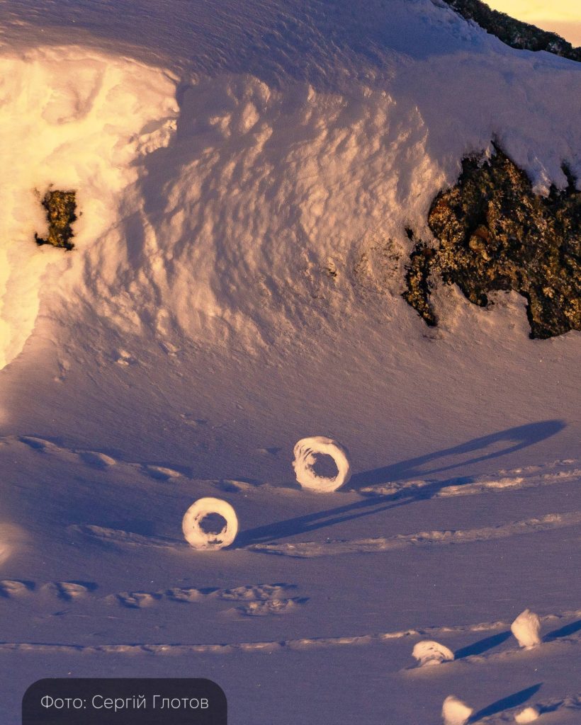 Це округлі снігові кільця з отвором посередині. Для їхнього утворення потрібні два шари снігу — твердий нижній і пухкий верхній, температура трохи вище нуля та вітер, достатній, щоб “скручувати” сніг у рулони. Сніг усередині швидко вивітрюється — так і формується характерна дірка.
