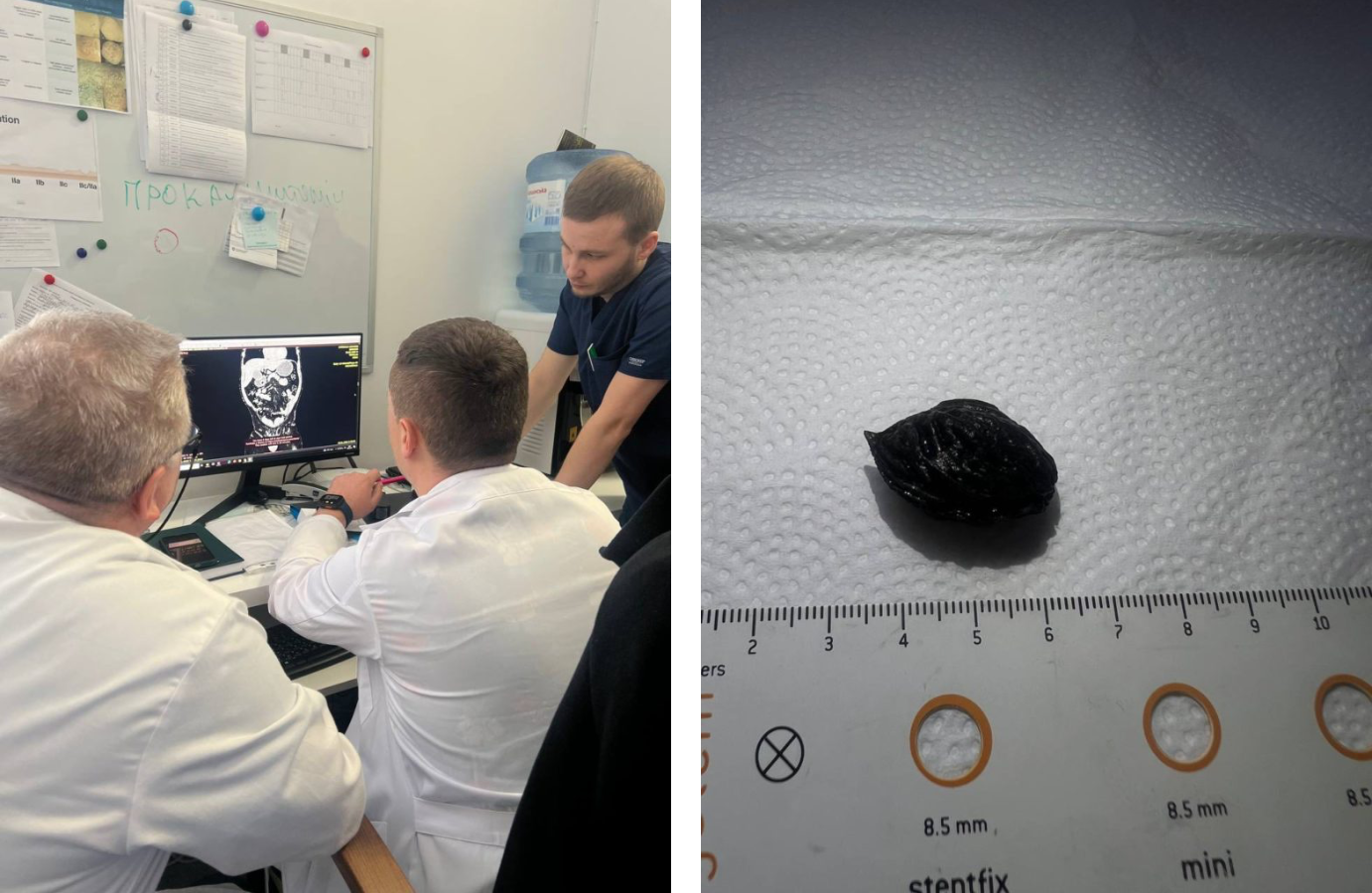 “Ми бачили на КТ, що “конкремент” нестандартний — із повітрям у центрі. Але навіть не уявляли, що витягнемо персикову кісточку. Це було цілковитою несподіванкою”, — розповідає керівник клініки хірургії Назар Була.
