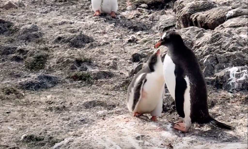 На відео Марії Павловської видно, як дорослий пінгвін годує малюка, а вже за кілька секунд кидається навтьоки. Маленьке пінгвіня, не погодившись із завершенням трапези, кидається навздогін.