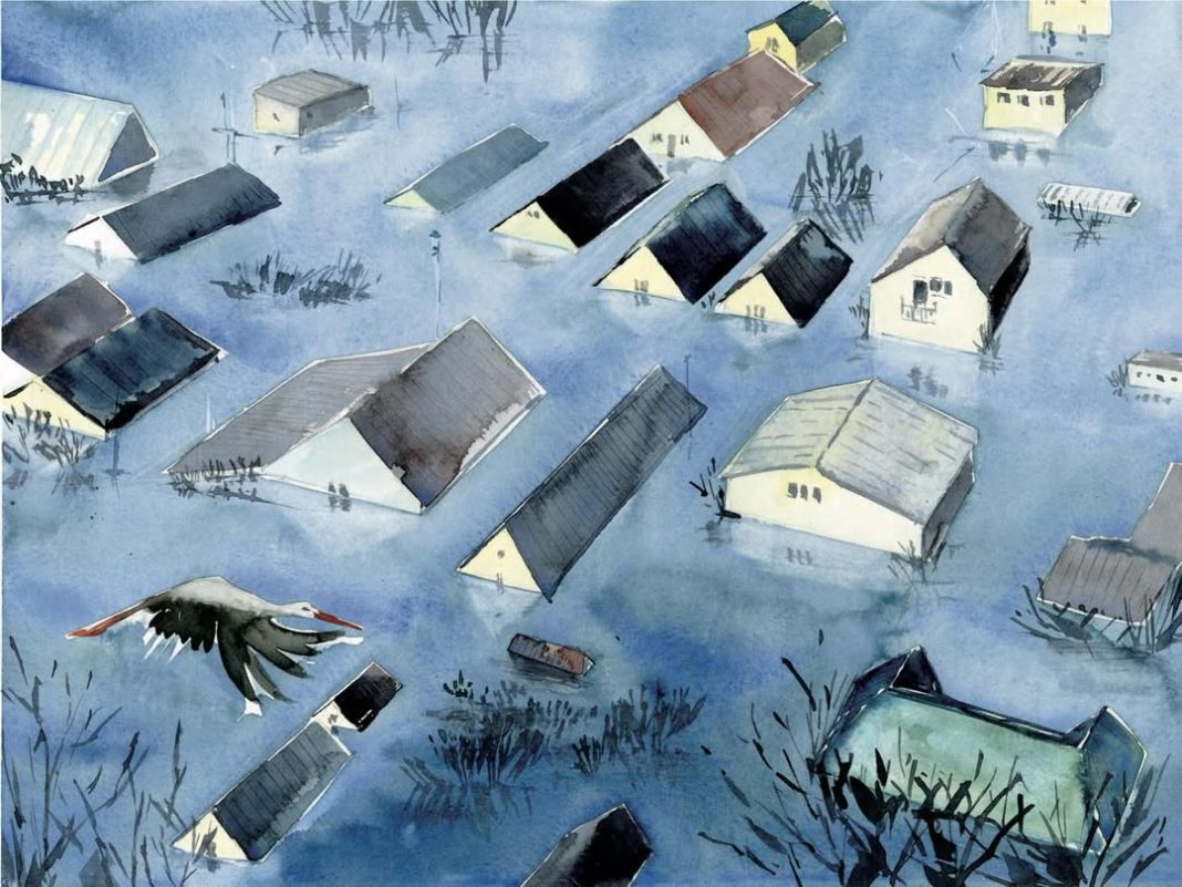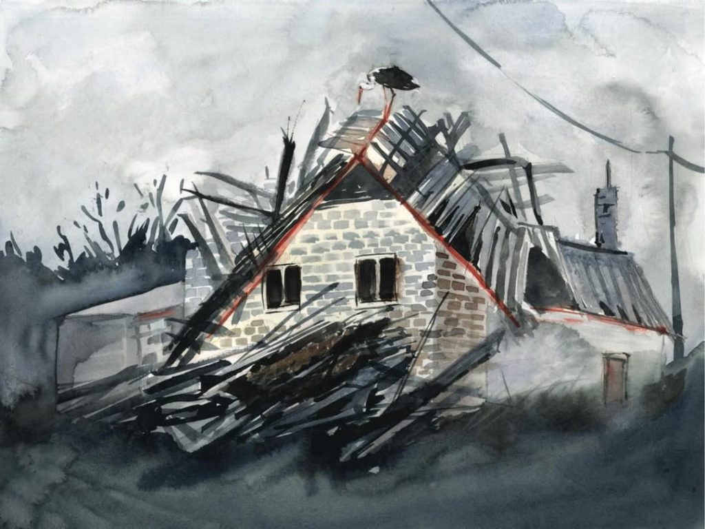 Книга не містить тексту — її наратив повністю побудований на зображеннях. Свідком подій стає лелека, який навесні повертається до свого зруйнованого дому. Через цей образ художниця передає наслідки повномасштабного російського вторгнення та створює емоційний візуальний простір про дім, пам’ять і руйнування.