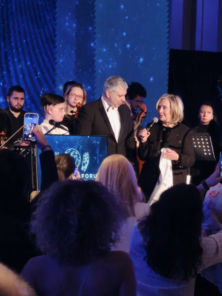 Серед гостей заходу була колишня держсекретарка США Гілларі Клінтон. Євген Афінеєвський подарував їй шарф українського бренду з дитячими малюнками.