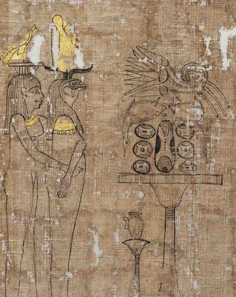 Окремі елементи — корони, сонячні диски, святилища — вкриті золотом. У давніх єгиптян золото символізувало божественність і вічність: воно не тьмяніє, а отже пов’язувалося з безсмертям. “Єгиптяни вірили, що боги мають золоту шкіру, срібні кістки й волосся з лазуриту”, — пояснює Барбаш. Крім сакрального значення, позолота свідчила й про статус: такі сувої могли дозволити собі лише заможні родини.