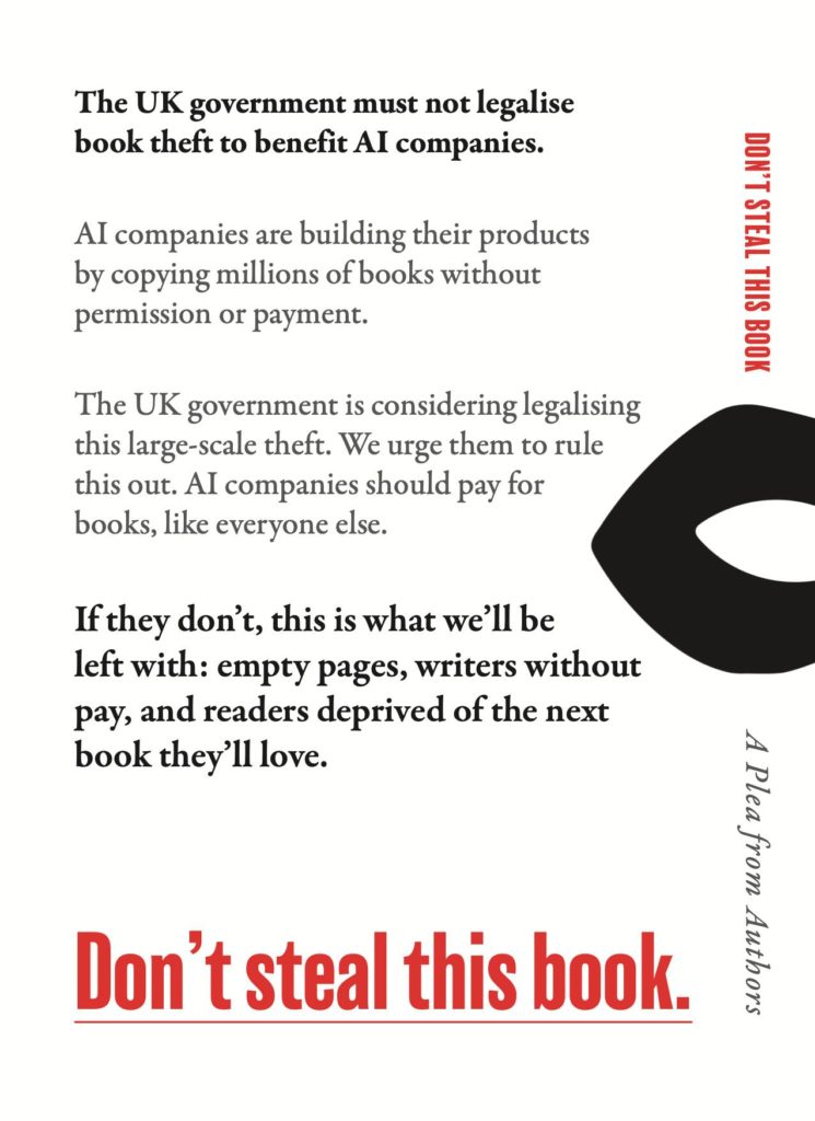 На обкладинці книги міститься коротке звернення: уряд не повинен “легалізувати крадіжку книг” на користь технологічних компаній.