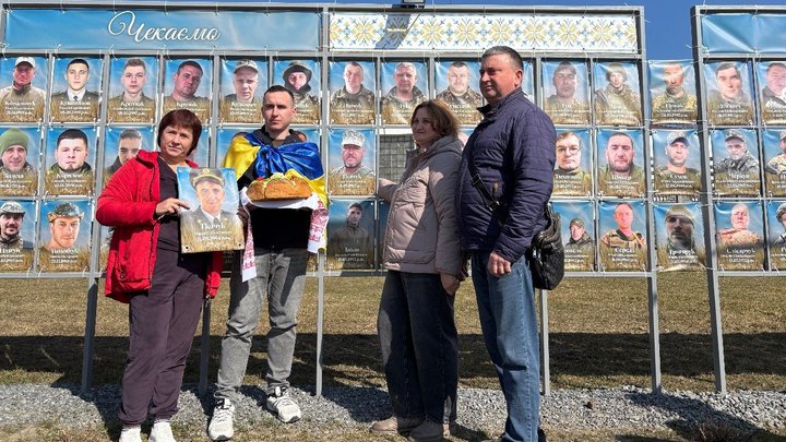 У місті Ізяслав звільнений з російського полону офіцер Василь Ткачук зняв власне фото з банера, на якому розміщені портрети полонених і зниклих безвісти захисників України.