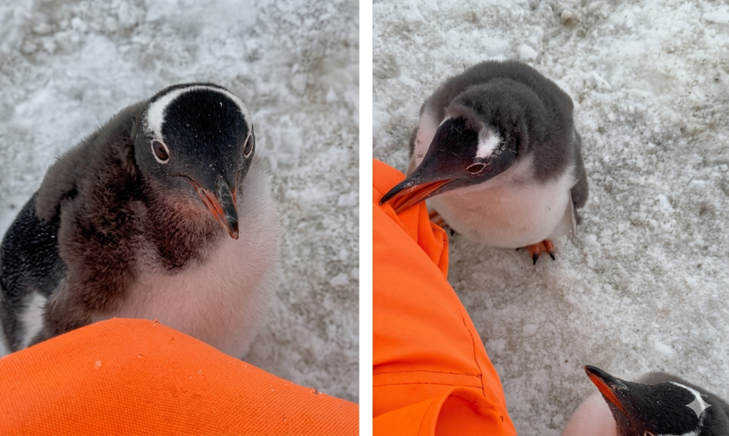 Поки науковиця присіла, щоб сфотографувати птахів, до неї підкралися двоє молодих пінгвінів. Спершу поводилися обережно, але швидко наважилися на контакт — почали дзьобати яскраво-помаранчевий комбінезон і навіть легенько бити крильцями.