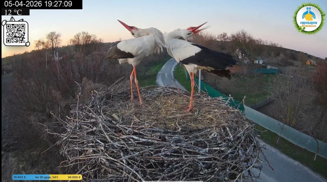 Вже за хвилину, о 12:38, до гнізда прилетіли Лель і Квітка (саме такі імена отримали нові мешканці “зіркового гнізда”). Майже одразу спалахнув конфлікт: Одарка атакувала Квітку, Лель втрутився і відігнав Одарку. Але це була лише перша сутичка. Впродовж наступних годин бійки повторювалися знову і знову — лелеки буквально змагалися за гніздо.