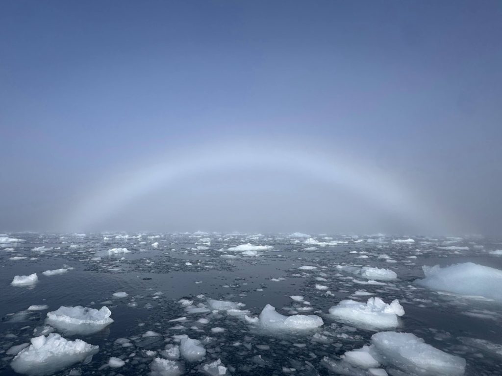 Українські полярники нагадують: веселка може бути не лише різнокольоровою, а й білою. Це явище називають “туманною веселкою” або fogbow — і воно виникає за особливих умов.