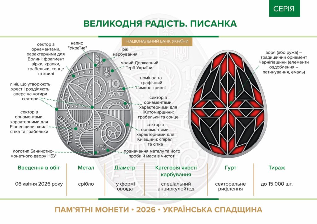 До Великодня в Україні з’явиться ще один символ свята — зі срібла. Національний банк продовжує торішню традицію і вводить в обіг пам’ятну монету у формі писанки. Вона має назву “Великодня радість. Писанка” та прославляє традиційні старовинні орнаменти Полісся.