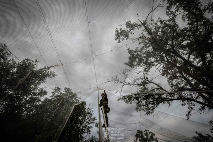 Такі сітки натягують між стовпами, створюючи “тунелі”, в яких пропелери FPV-дронів заплутуються й зриваються з курсу. Українські військові також навчилися скидати шматки сіток з власних дронів на ворожі, щоб нейтралізувати їх.