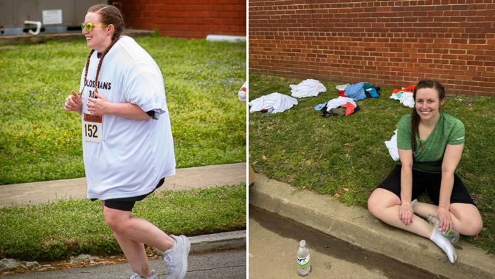 На старті вона з’явилася, буквально “запакована” у десятки шарів одягу. А на фініші — після майже чотирьох годин зусиль — перетнула лінію, несучи на собі цей незвичний вантаж.